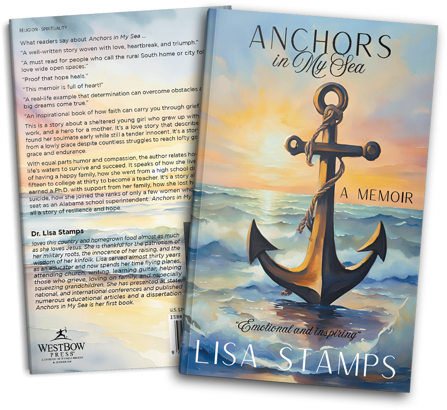 With equal parts humor and compassion, the author relates how she waded life’s waters to survive and succeed. It speaks of how she lived her dream of having a happy family, how she went from a high school dropout at age fifteen to college at thirty to become a teacher. It’s a story about how she earned a Ph.D. with support from her family, how she lost her husband to suicide, how she joined the ranks of only a few women who sat in the top seat as an Alabama school superintendent. Anchors in My Sea is most of all a story of resilience and hope.